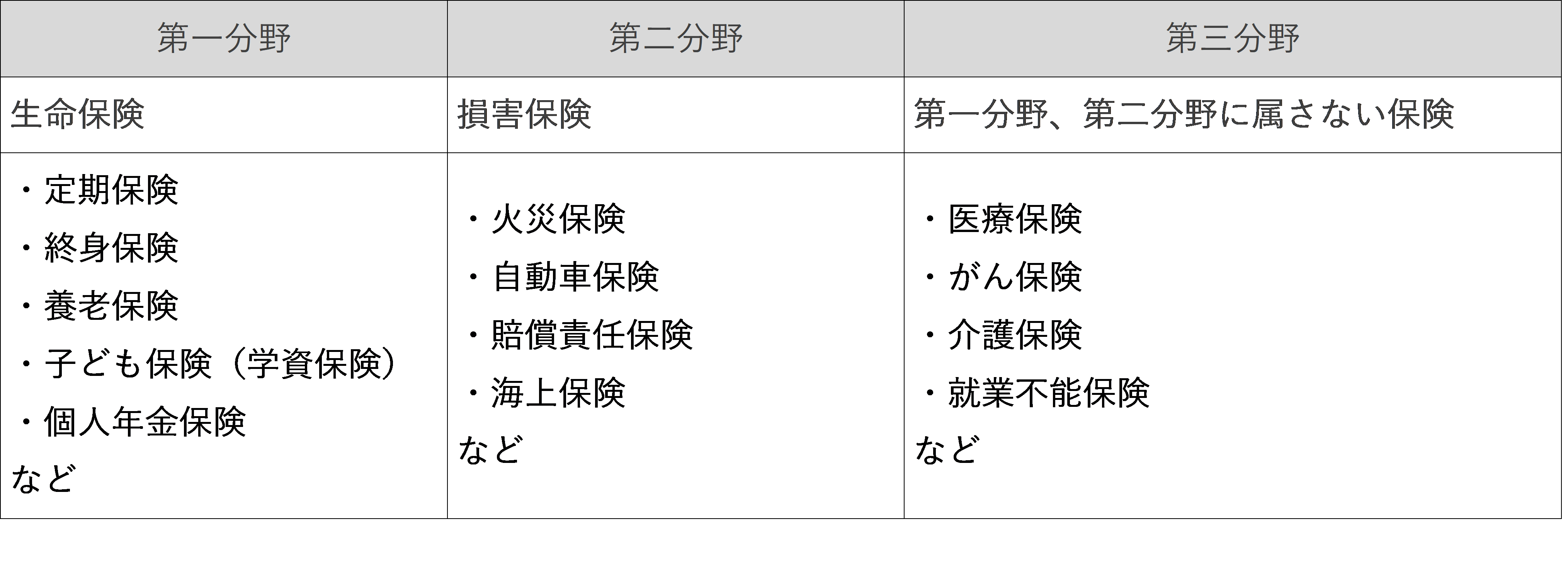 日本で取り扱っている保険は、定期保険や終身保険などの生命保険固有の分野である「第一分野」、火災保険や自動車保険などの損害保険固有の分野である「第二分野」、そして「第一分野」と「第二分野」の両分野に属するもの、あるいはどちらにも属さない「第三分野」に分類されています(表1)。